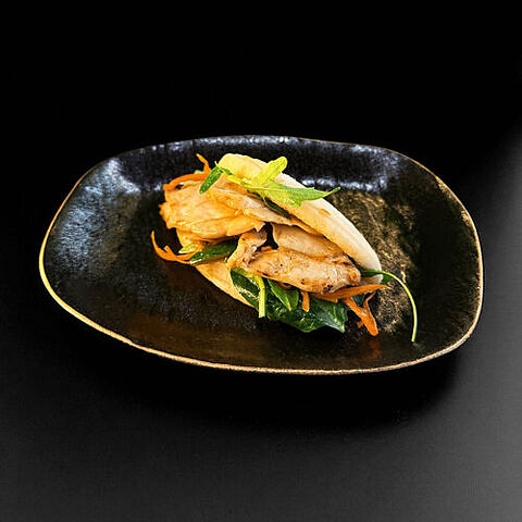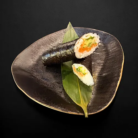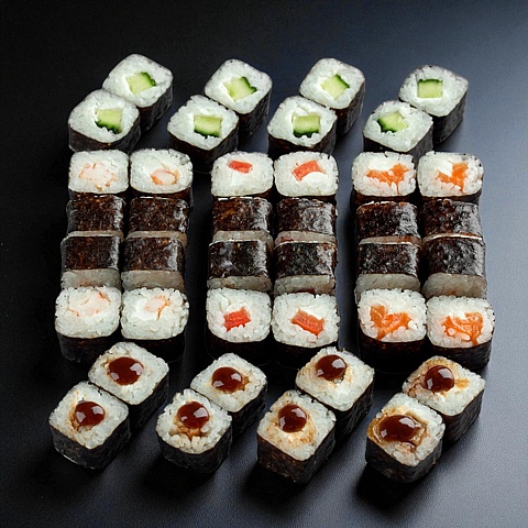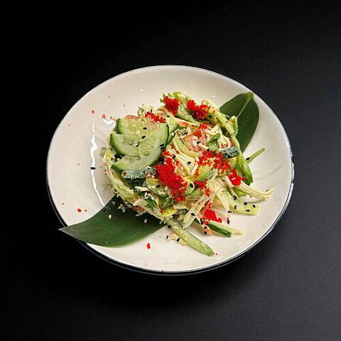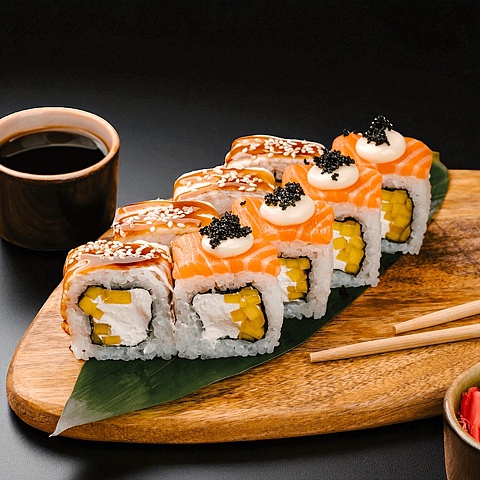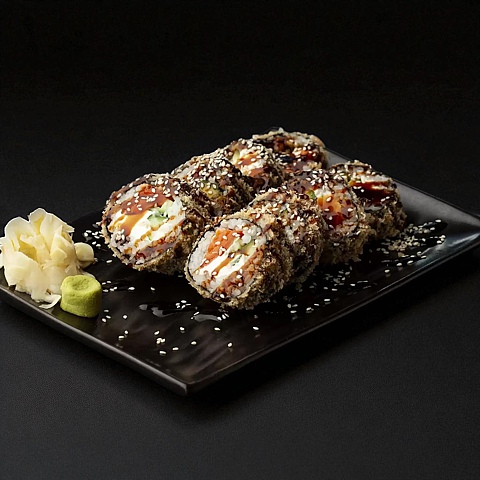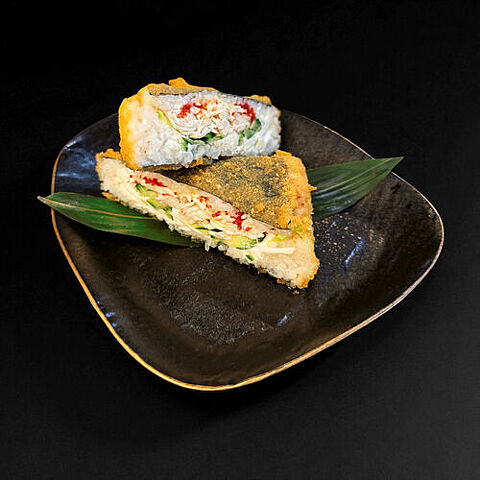 Сочные рисовые треугольники, наполненные нежным творожным сыром, свежими огурцами и имитацией краба, покрытые хрустящей панировкой и дополненные японским майонезом